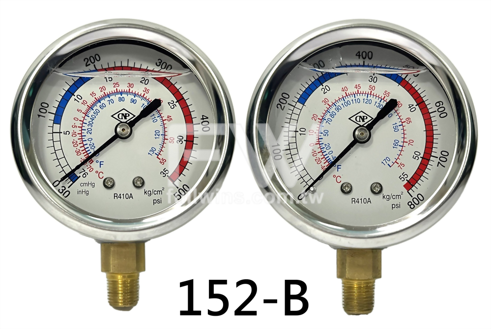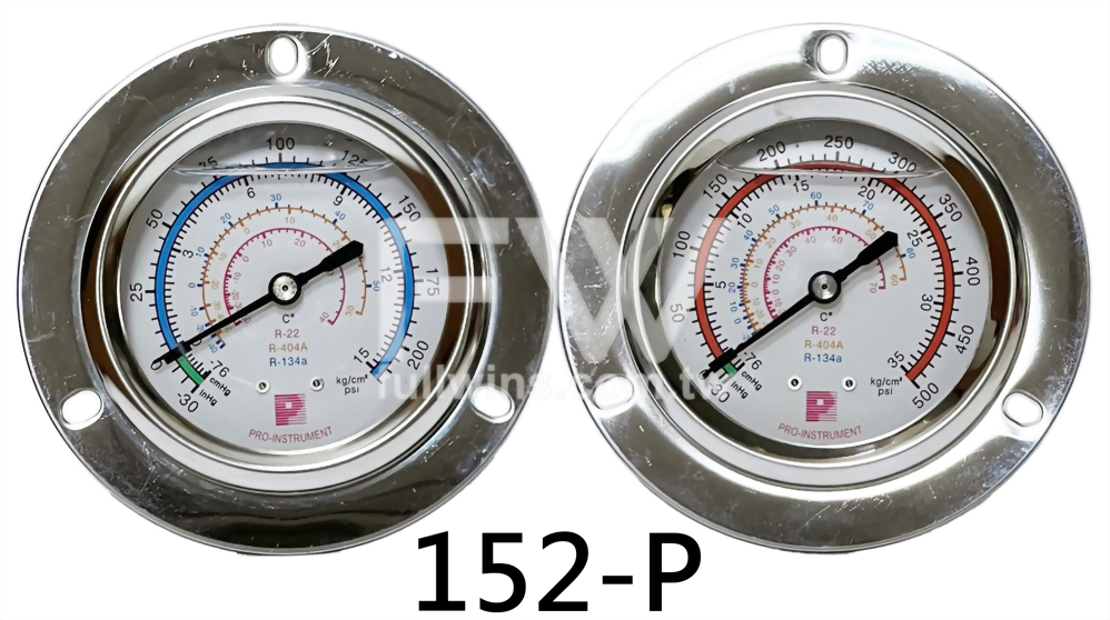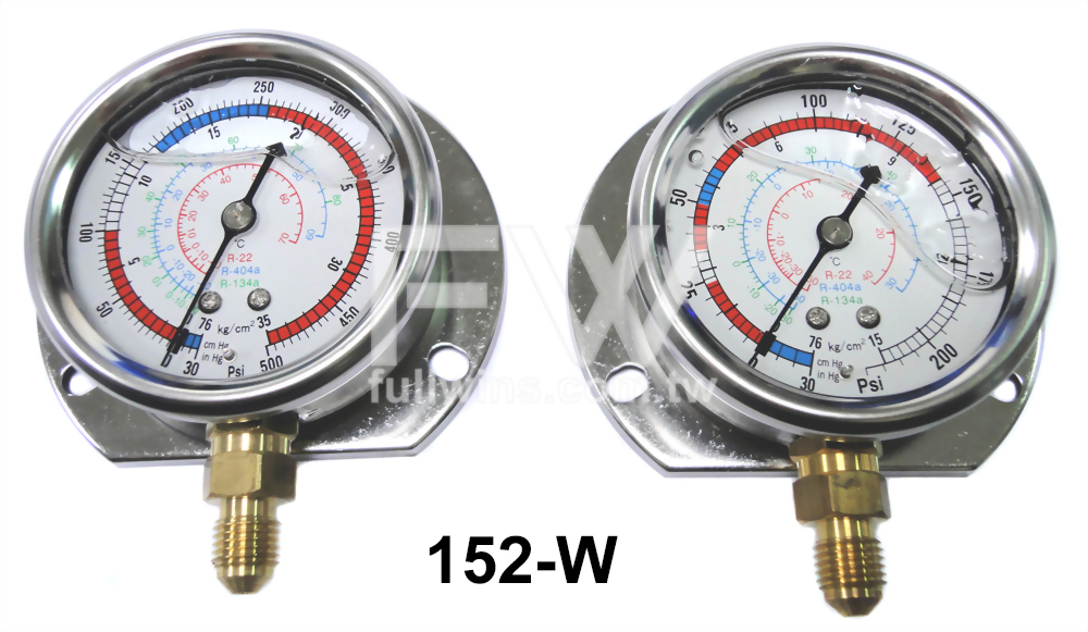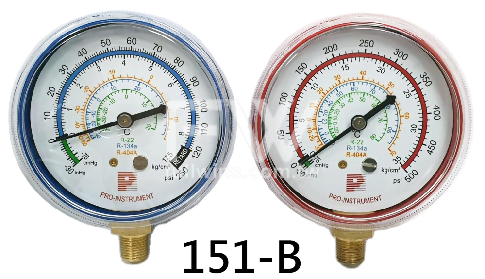 R22, R134a, R404a, R407c: Low pressure : -30inHg~0~250psi & -76cmHg~0~15kg/cm2 High pressure : 0~500psi & 0~35kg/cm2 R410a: Low pressure : -76cmHg~35kg & -30inHg~500psi High pressure : 0~55kg & 0~800psi |